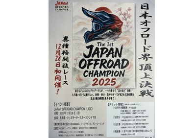 こんにちは。ヒラタ自動車です。 2025年12月28日(日)に奈良県吉野郡下市町 ウッズモータースポーツランド下市でジャパン オフロード チャンピオン 2025が開催されます。 マイカルチャンプを筆頭にKawasakiで参戦するライダーを当店と一緒に応援しましょう!(参戦ライダーは大会公式HPの「ライダー紹介」をご確認ください)ご興味のある方はぜひお問い合わせください。